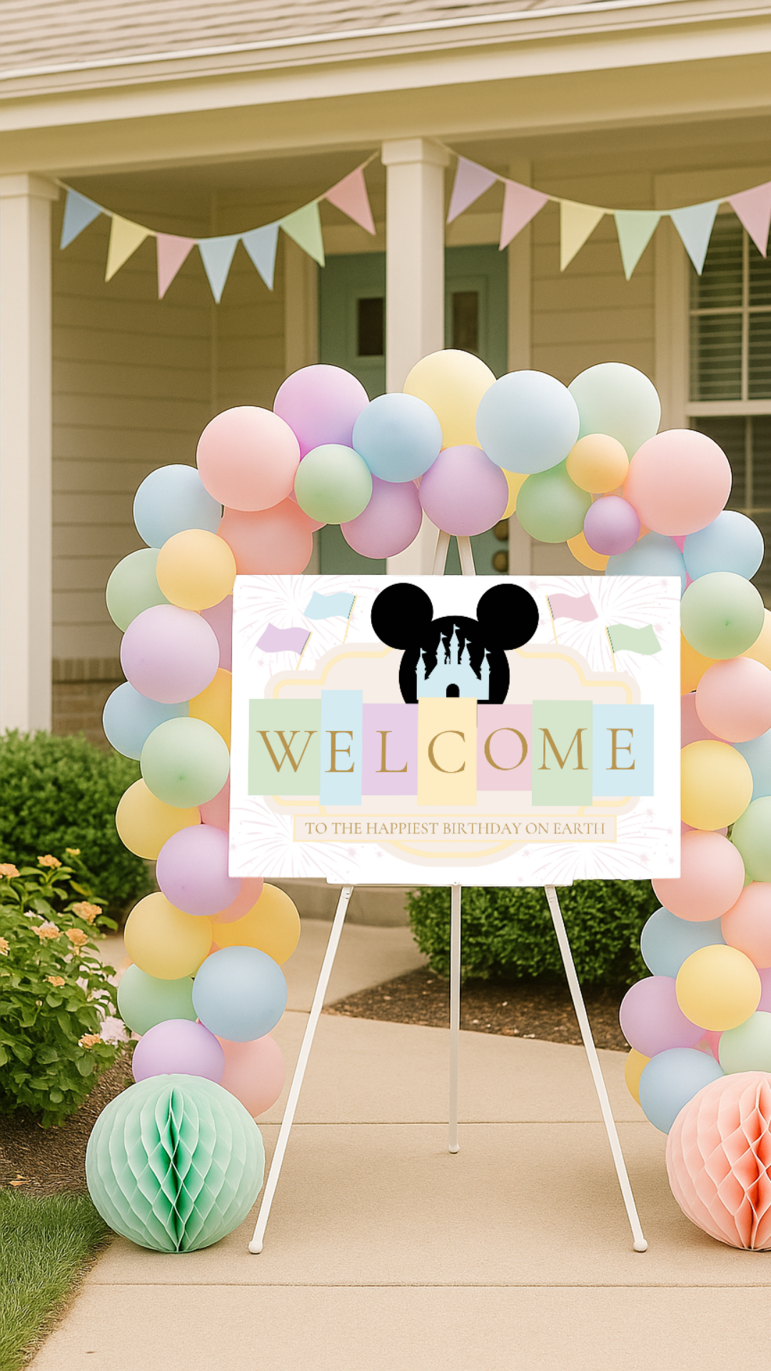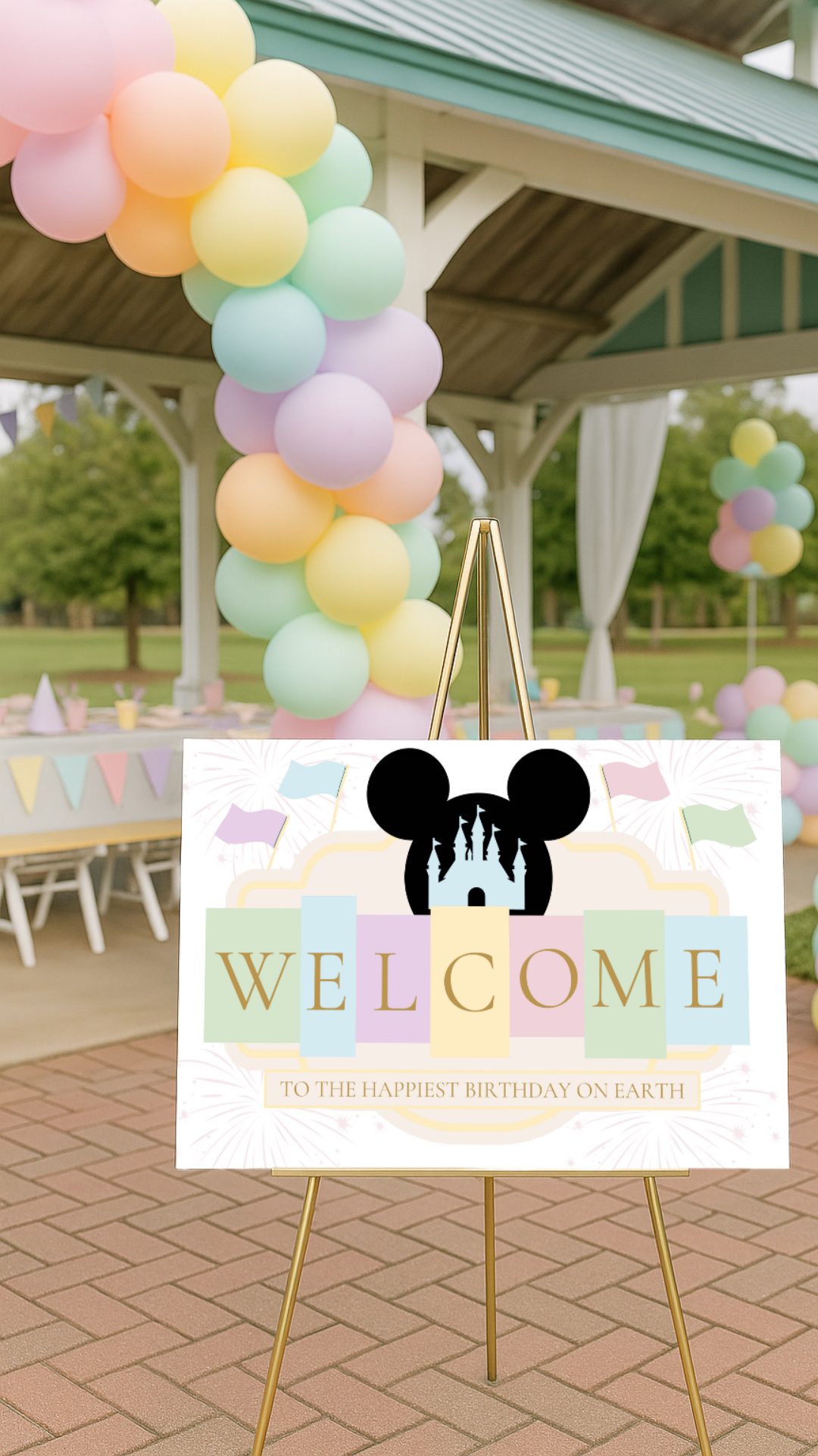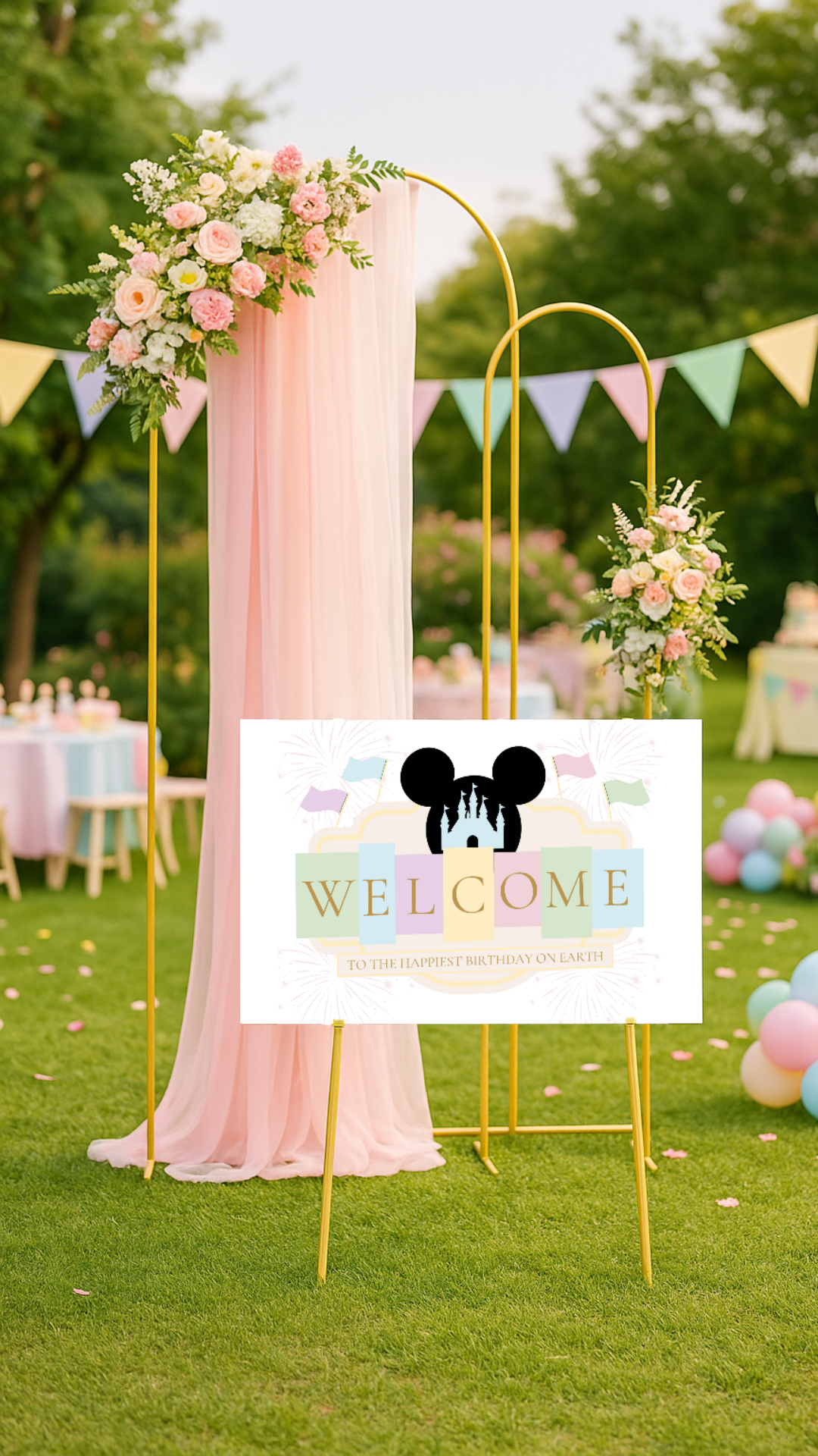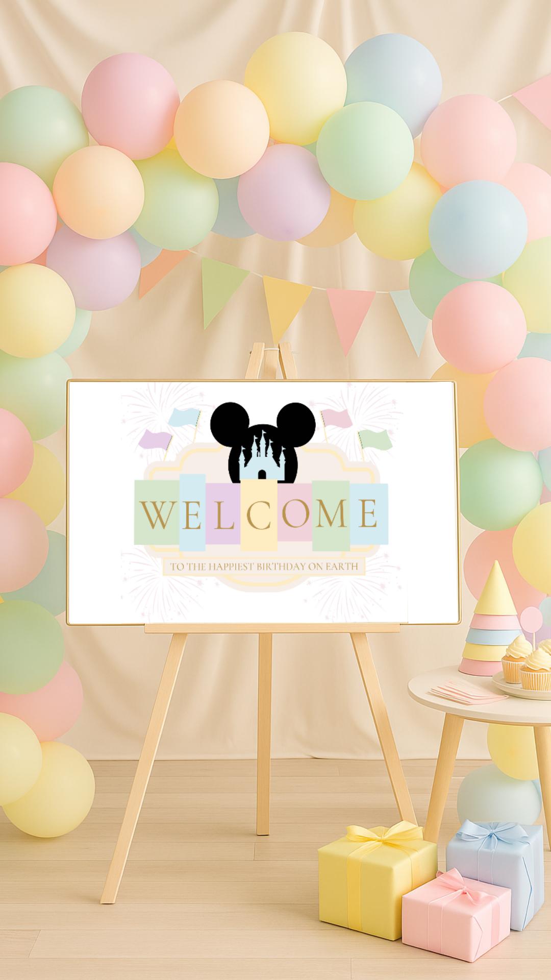 Bring the magic to your little one’s big day with this Disney-inspired pastel welcome sign! Designed with soft watercolor tones, castle silhouette, Mickey ears, and playful flags, this printable sign sets the perfect tone for a first birthday or any whimsical celebration.